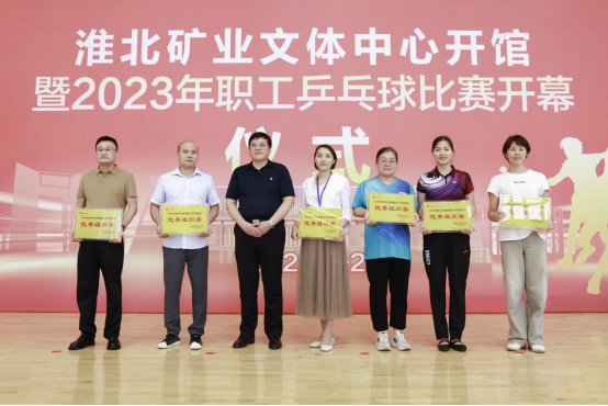 在中秋、國慶來臨之際,9月26至27日,淮北礦業集團在新落成的文體中心舉辦“喜迎國慶、‘乒’搏有你”2023年職工乒乓球比賽,經過兩天的激烈比拼,決出了男子團體、女子團體、男子單打、女子單打、優秀組織獎等各類獎項,集團工會第一副主席劉杰和工會、物業分公司相關負責人為獲獎單位和選手頒獎。