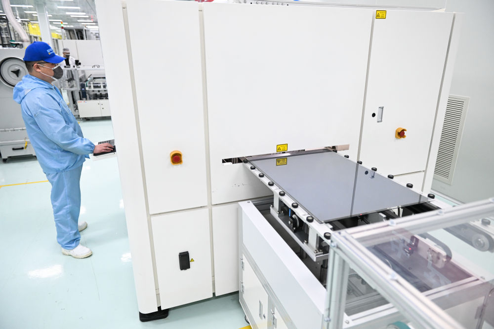 2024年2月29日,在位于江蘇省無錫市錫山區(qū)的極電光能有限公司智能生產(chǎn)車間,鈣鈦礦光伏組件正在自動化生產(chǎn)線上進(jìn)行激光劃刻工藝。新華社記者 季春鵬 攝