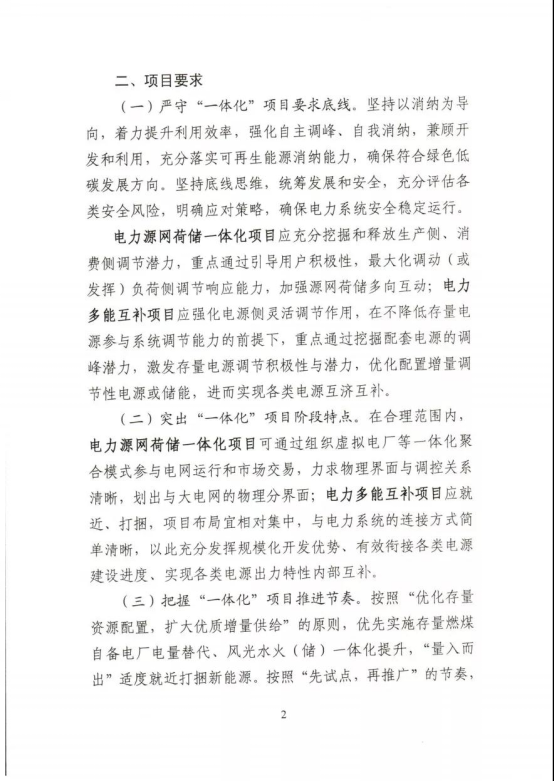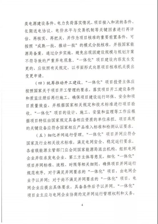 工作要求:積極開(kāi)展方案論證。科學(xué)有序評(píng)估納規(guī)。落實(shí)項(xiàng)目核準(zhǔn)要求。統(tǒng)籌推動(dòng)開(kāi)工建設(shè)。細(xì)化并網(wǎng)運(yùn)行管理。優(yōu)先推進(jìn)鄉(xiāng)村振興項(xiàng)目。鼓勵(lì)重大創(chuàng)新示范。在上述工作要求中,《通知》要求,各省級(jí)能源主管部門(mén)應(yīng)開(kāi)展“一體化”項(xiàng)目評(píng)估工作,與國(guó)家“十四五”可再生能源發(fā)展規(guī)劃充分銜接,逐項(xiàng)論證明確“一體化”項(xiàng)目立項(xiàng)條件、消納條件、建設(shè)規(guī)模、接入系統(tǒng)方案、配套電網(wǎng)工程等,在充分征求相關(guān)電力企業(yè)意見(jiàn)基礎(chǔ)上,于12月底前擇優(yōu)納入本省(區(qū)、市)電力規(guī)劃。